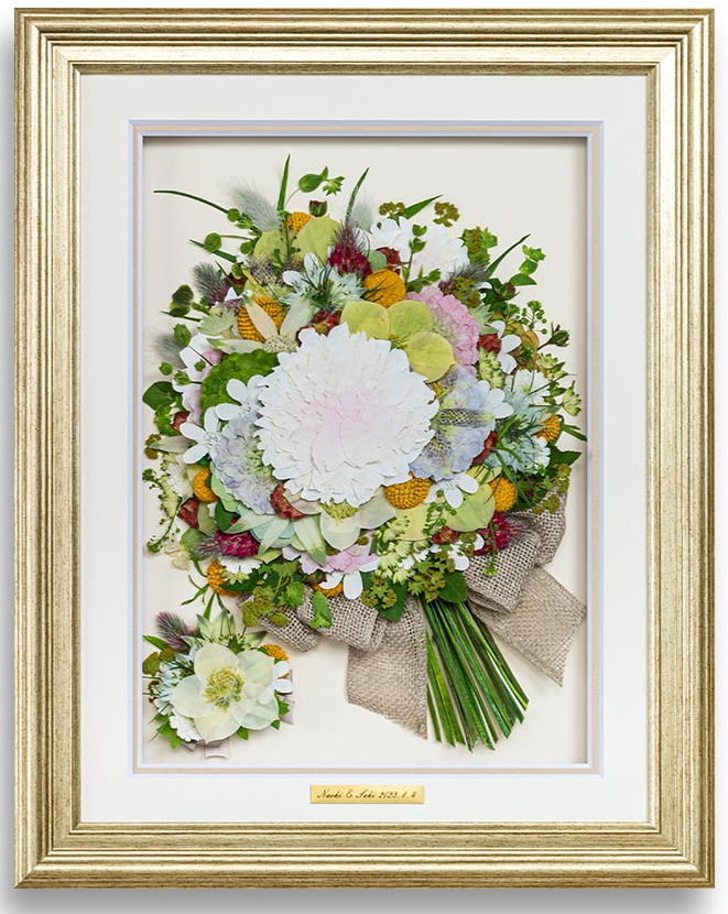 〜〜美しさを追求した立体押し花〜〜 他とは全く違う特殊立体押し花技法 厚さ約1センチの空間で花びらを何層にも重ねてデザイン 本物のブーケに近い花のふくらみを再現 立体感や色鮮やかさが他社とは全く異なる仕上がりです 他では真似することができない群を抜いた技術の高さと 『美』を追及してつくり上げる作品はまさに芸術品と言っても過言ではありません |