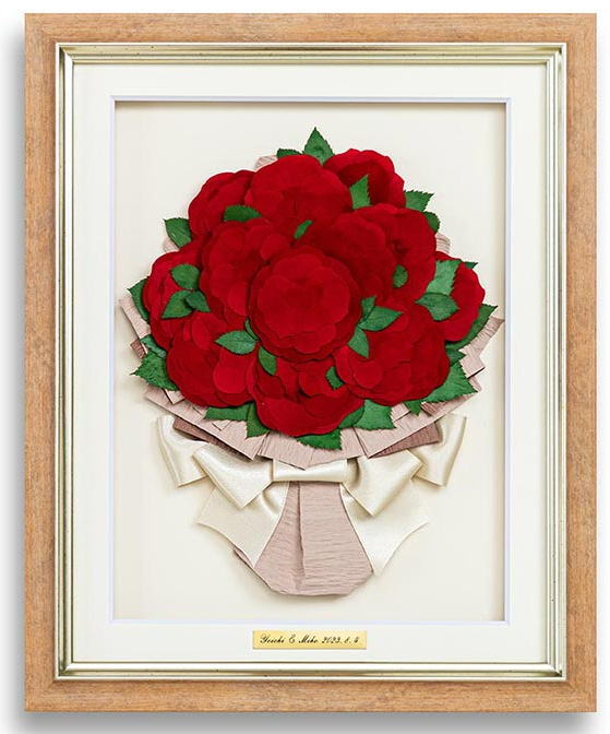 ![]() ![]() ![]() ・・・ミルクティーS・・・ フレームには濃淡の塗装をし、シルバーの金属部分には 茶色の模様のフィルムを貼り、アンティーク調に仕上げたフレーム 画像はオプションのネームプレート付き ブートニア付き です ブートニア ネームプレートをご入用の場合は オプション購入をお願いいたします バラの花束は12本程度入ります