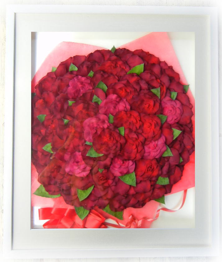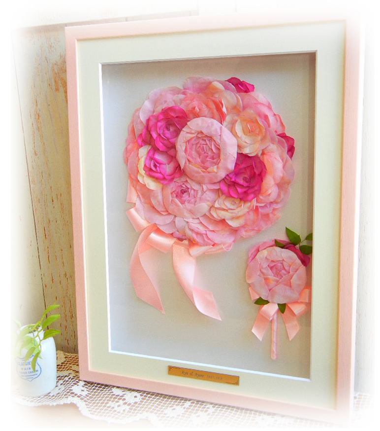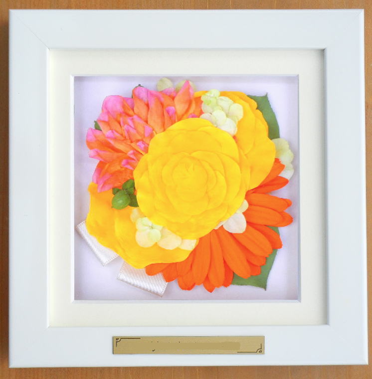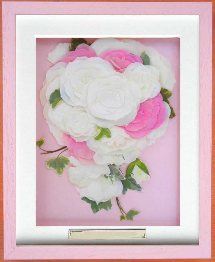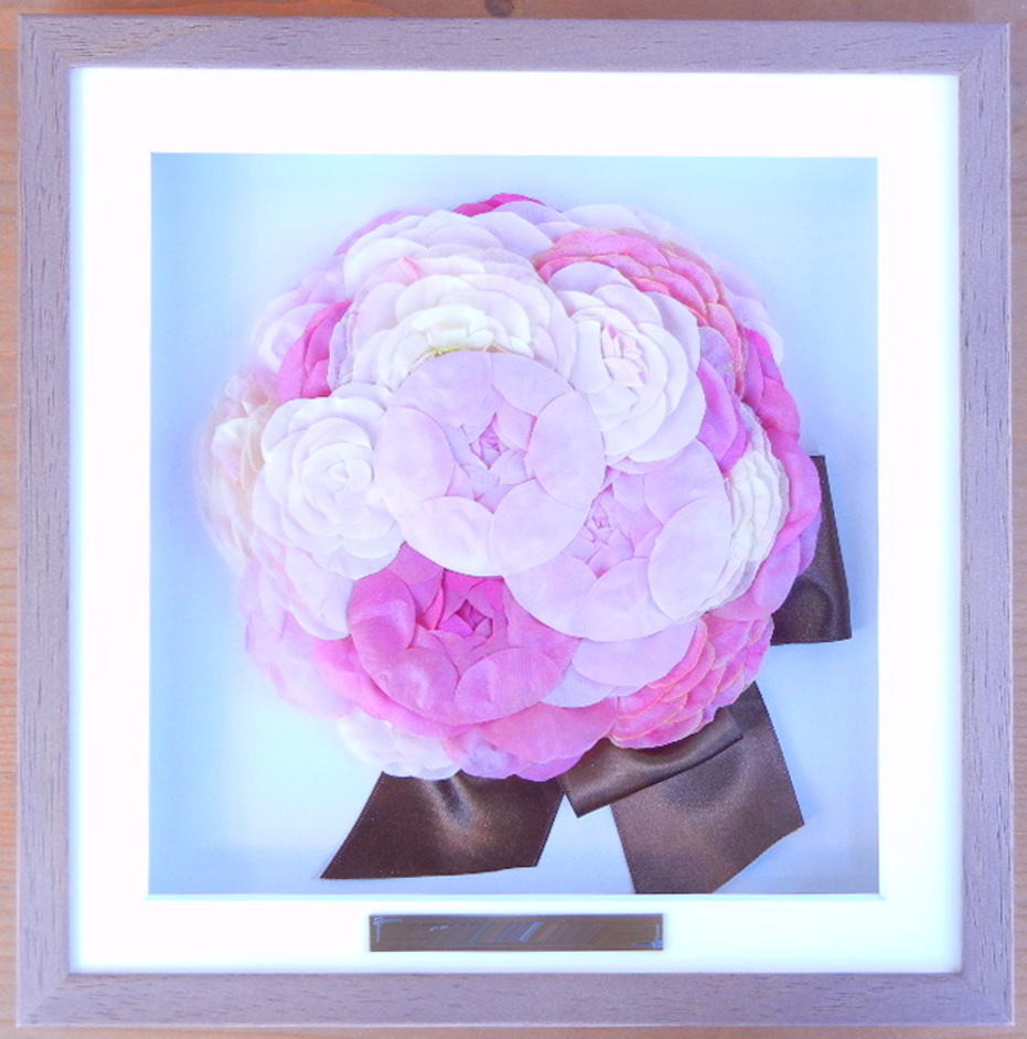ドライ加工にも用いる遠赤外線装置を押し花加工にも使用しております。 プレスしたお花を装置にかけることにより、お花の色素がよりきれいに発色します 浮き出た感じの立体的な押し花 ♪☆◎♪☆◎♪☆◎♪☆◎♪☆◎★♪☆◎♪☆◎♪☆◎♪☆◎♪☆◎★ お花の仕上がりにより使用できない花材もございます。 届きましたブーケをドライ加工させていただきますが 傷みの激しい場合 痛みの激しい場合はご相談させていただきます 大輪の花材につきましてはスペース的にお入れできない場合や お花の一部のパーツのみ使用となる場合がございます 厚みのある実物やアクセサリー等をお入れした場合バック地に多少しわが入る場合がございます 加工により色彩が変わる場合があります。 ブーケ以外の花材(ブートニア ヘッドパーツ等)もお送りいただいた場合は ブーケ本体に織り込んで製作させていただきます。(ブーケと異種の花材の場合はアトリエの判断でお入れしない場合もございます) ただしオプションでブートニアをお申し込みの場合はブートニアを独立してお残しいたします。 ブーケに使用された資材(リボンやパールのアクセサリー等)は押し花にお入れできない場合もございます。 またアトリエの判断で加工させていただいたり、代替とさせていただく場合もございます。 基本的にフレーム内のデザインはお預かりいたしましたブーケのスタイルを基にデザインさせていただきます。 花びらや葉が落ちる場合がございますがご了承願います。 加工途中の状態をご覧頂くことは出来かねます。 (特殊加工において作業中断等による品質低下を防ぐため) お入れできない分の花材につきましてのご返却は出来かねます。 資材(かごやリボン、アクセサリー等)につきましては、原則といたしましてご返却はいたしておりません 生花の時点で同じようなお色の花でも、乾燥による色素の出方は異なってきます。 グリーン系・黄色系・薄いピンク系のお花は色素が抜けやすい傾向がございます。 白はアイボリーやクリーム系に発色する傾向がございます。 同じ白のお花でも出方は異なります。 赤系・濃紅のお花は黒っぽくなります