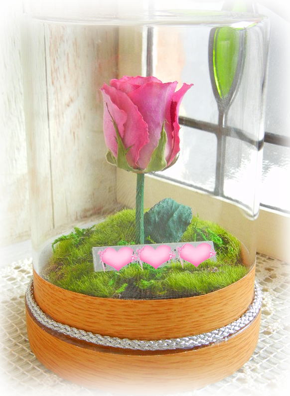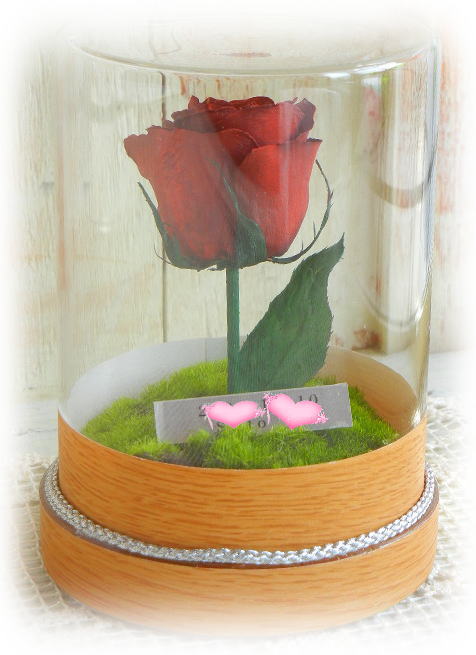 脱酸素処理をした密封ガラス空間を作り出し、その中へ加工したお花を密封保存することで