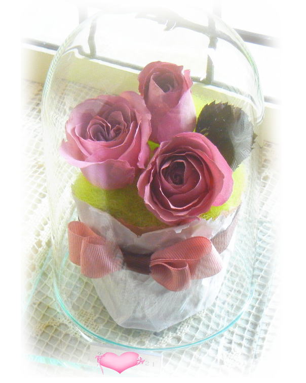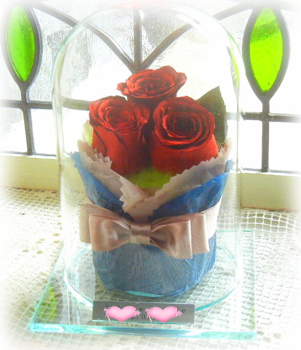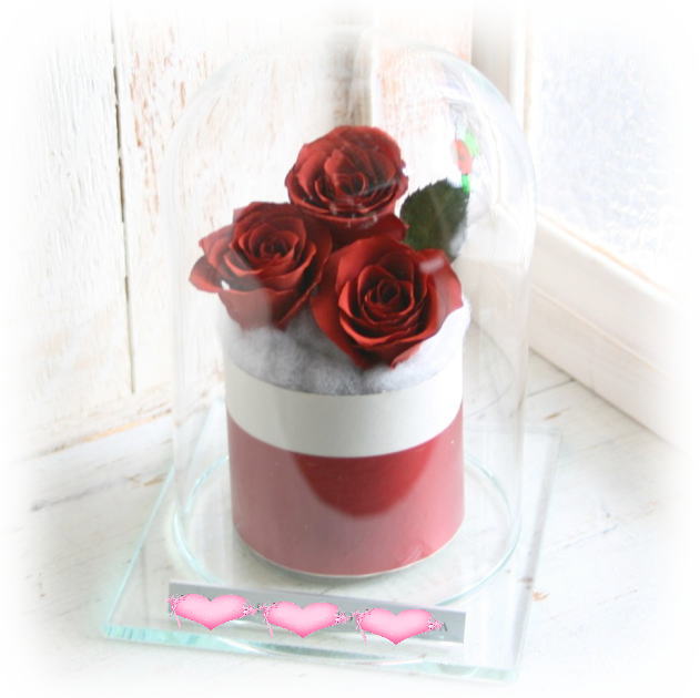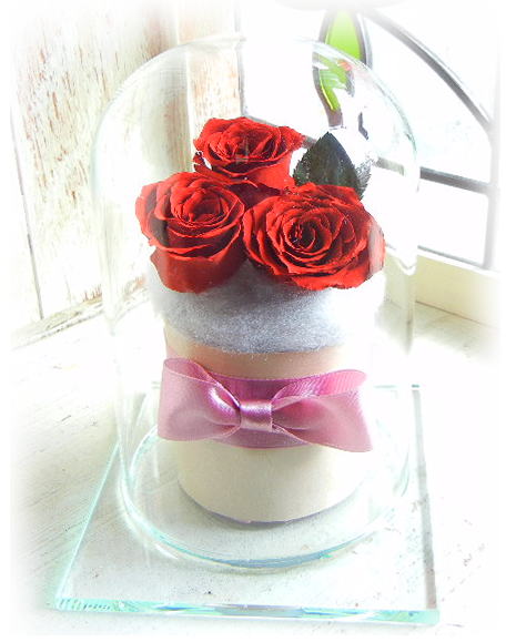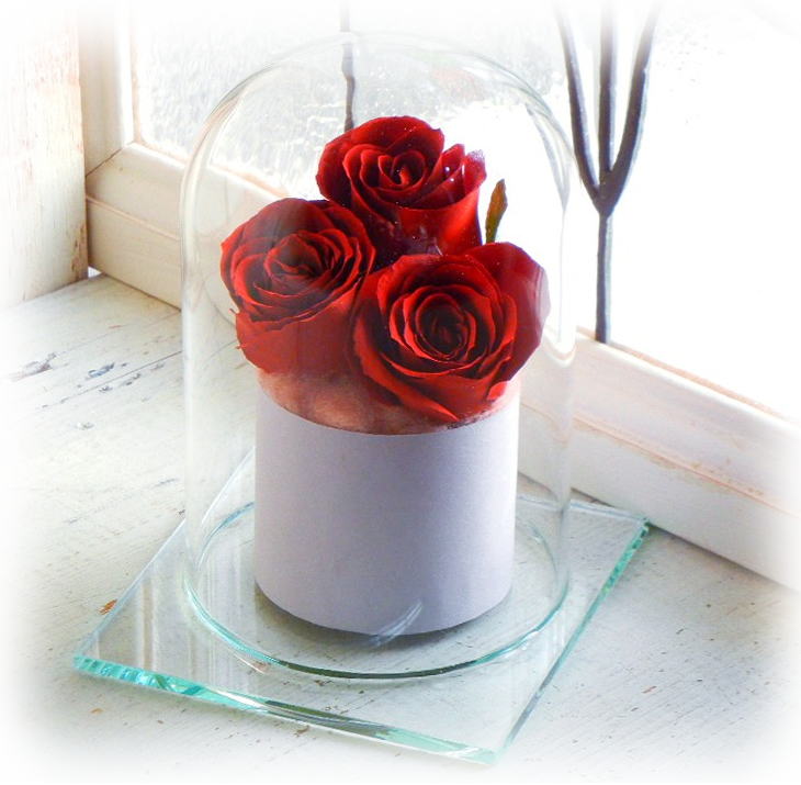 脱酸素処理をした密封ガラス空間を作り出し、その中へ加工したお花を密封保存することで